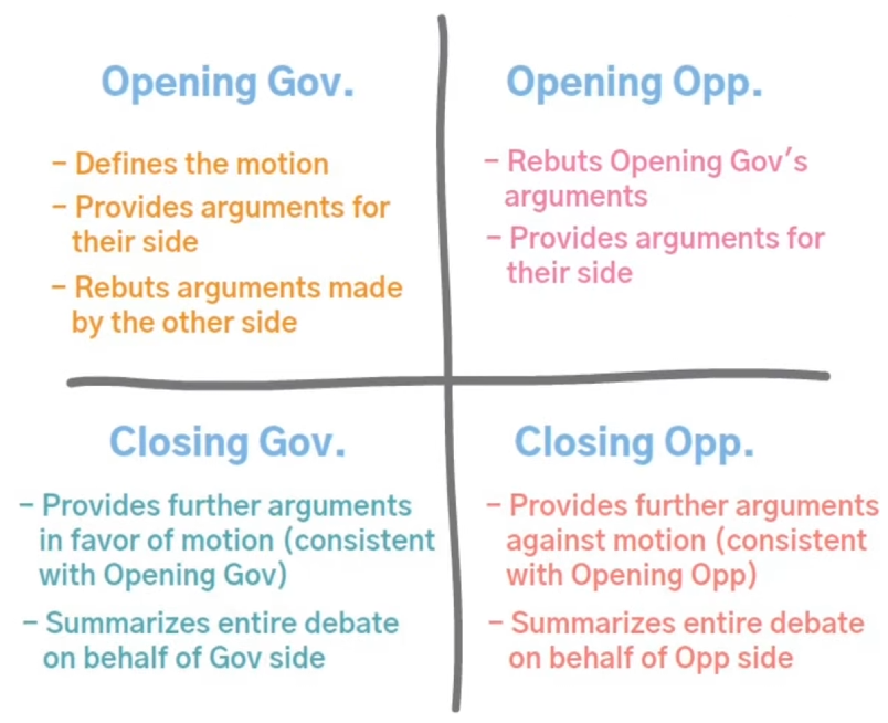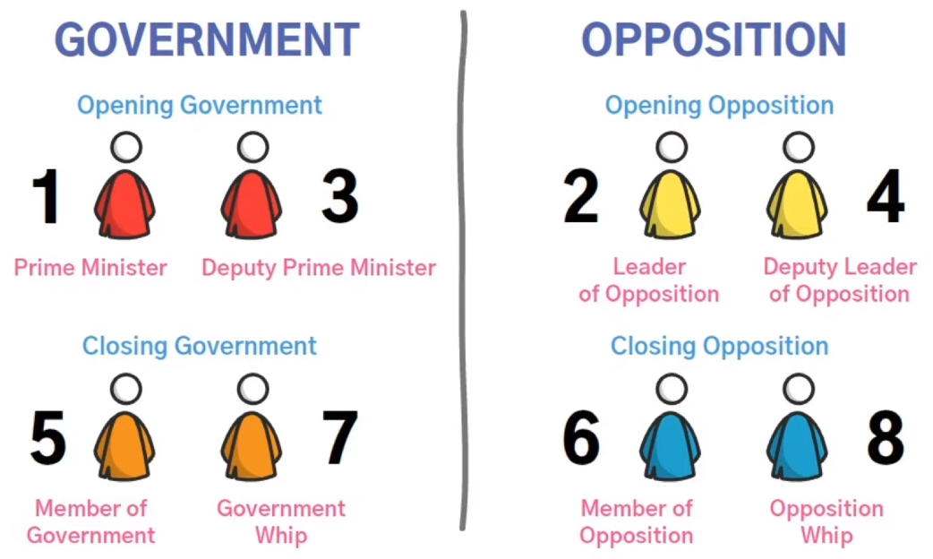 - POI: Point Of Information, 앞 뒤 1분을 제외한 연설시간(unprotected time) 도중 질문. 수락, 거절 가능.