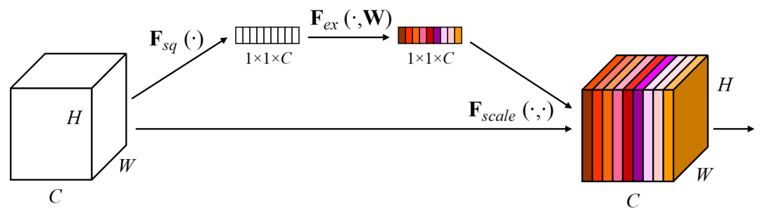 SE block consists of the two operations: squeeze and excitation operations. The original feature maps are rescaled using the channel-wise weights produced by the excitation operation. SE block can be integrated into various existing architectures, not just used as a standalone network.