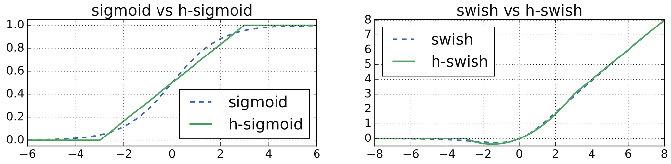 The sigmoid functions used for SE-block are substituted with the hard sigmoid function more computationally light. And the ReLU used in the mobileNet v2 is replaced with hard swish activation function
