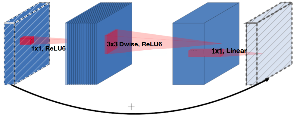 MobileNet v2 introduced the inverted residual block consists of three layers: expansion, depthwise convolution, and projection layer. The expansion layer expands the input to a higher dimension The projection layer reduces back the channel size , where . Some of the ReLU activation functions in the narrow layers are replaced with the other (ReLU6 or Linear) to prevent information loss.