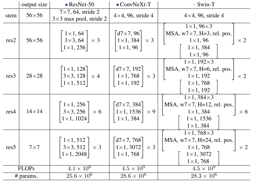 Instead of the traditional convolution with stride , ConvNext uses a convolution with stride (non-overlapping) for initial downsampling. It mimics the patchify stem used in ViT.