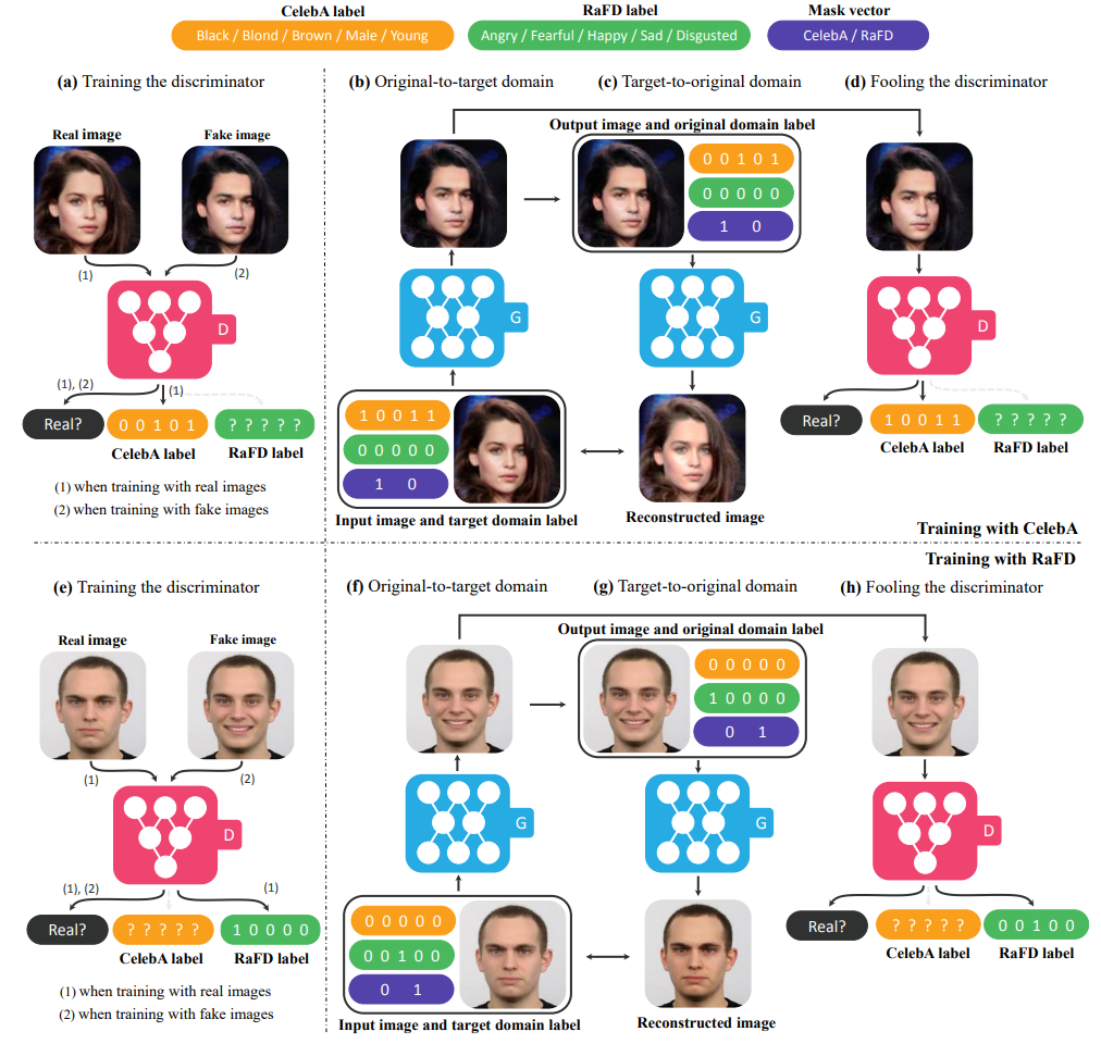 The generator takes an input image and a target domain label to produce the translated image, and the discriminator network that not only distinguishes between real and fake images but also classifies the domain of the input image.