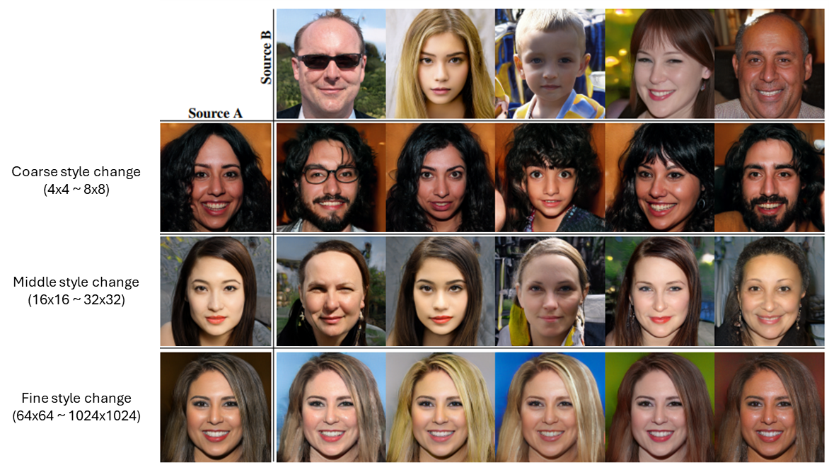 The network starts generating low-resolution images and progressively increases the resolution. We can control the rate of style change by controlling the stage AdaIN appended.