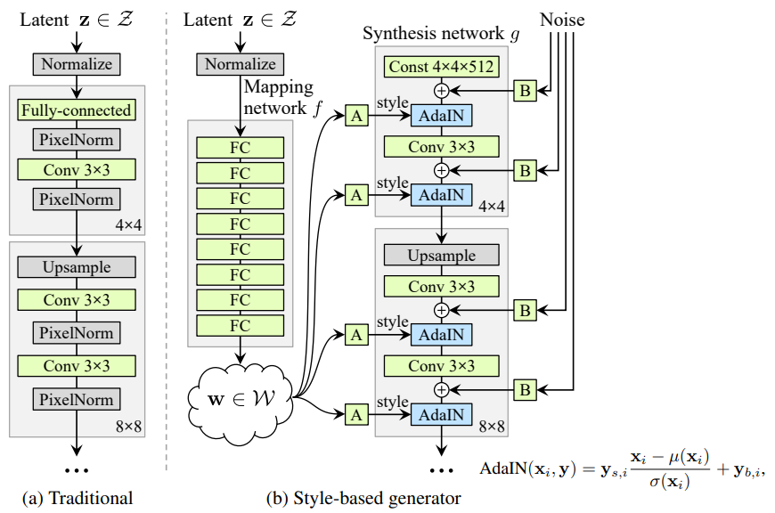 The AdaIN operation is defined as where is the -th feature map, and are style scale and bias, and and are the mean and standard deviation of .