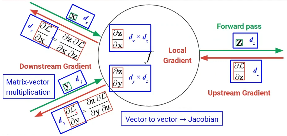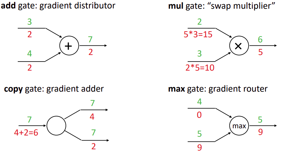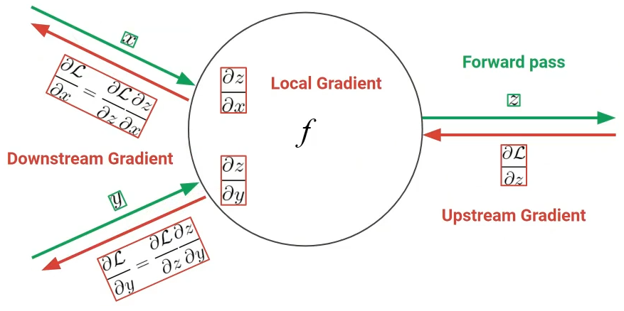 The downstream gradients of a node are calculated by the product of the upstream gradient and the local gradient.