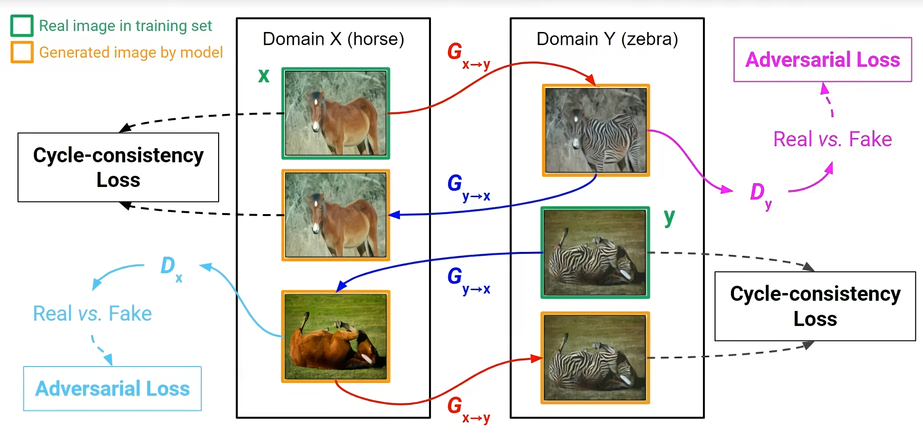 Adversarial loss (): Adversarial loss (): Cycle-consistency loss: where: