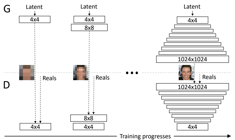 Training starts with both D and G having a very low resolution. During training, gradually add new layers to both the D and G to increase the resolution.