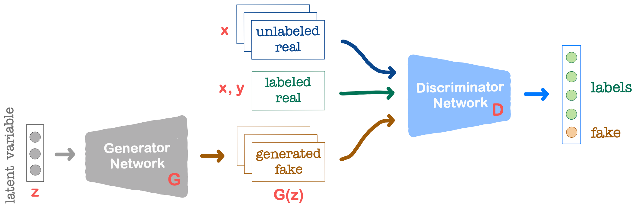 Semi-supervised GAN (SGAN) is a variation of the GAN that takes both labeled and unlabeled data in the training process. The model aims to create a data-efficient classifier and to improve the generating quality.