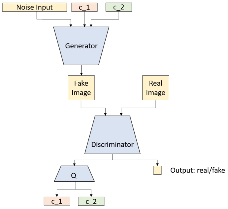 Information maximizing GAN (InfoGAN) is an extension of the GAN architecture that aims to learn disentangled representations in an unsupervised manner. InfoGAN introduces a latent code in addition to the noise vector . This latent code is designed to capture interpretable and meaningful features of the generated data.