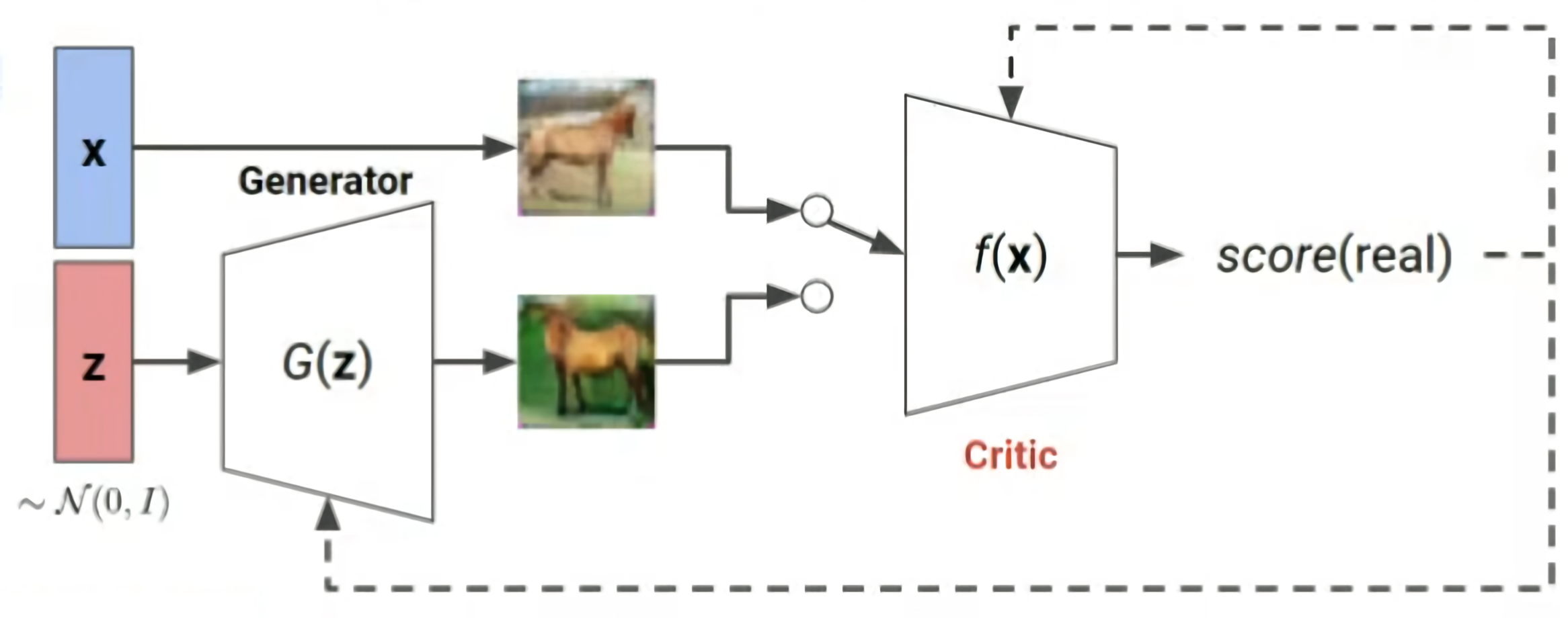 In WGAN, the discriminator of traditional GAN is replaced by a critic that is trained to approximate the Wasserstein Distance. The critic outputs a real number instead of a probability.