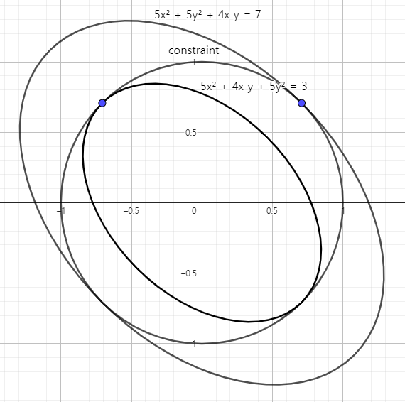 - the minimum of , as the smallest eigenvalue at the point of the corresponding eigenvector where the condition is called the constraint and the minimum and maximum are called the constrained extreme