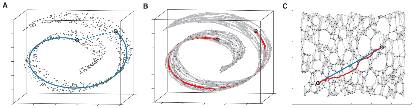 Isomapis a non-linear dimensional reduction method that aims to preserve the intrinsic geometry of high-dimensional data in a lower-dimensional space. The main idea of isomap is to approximate the geodesic distances between data points on a manifold, rather than just using straight-line Euclidean distances.