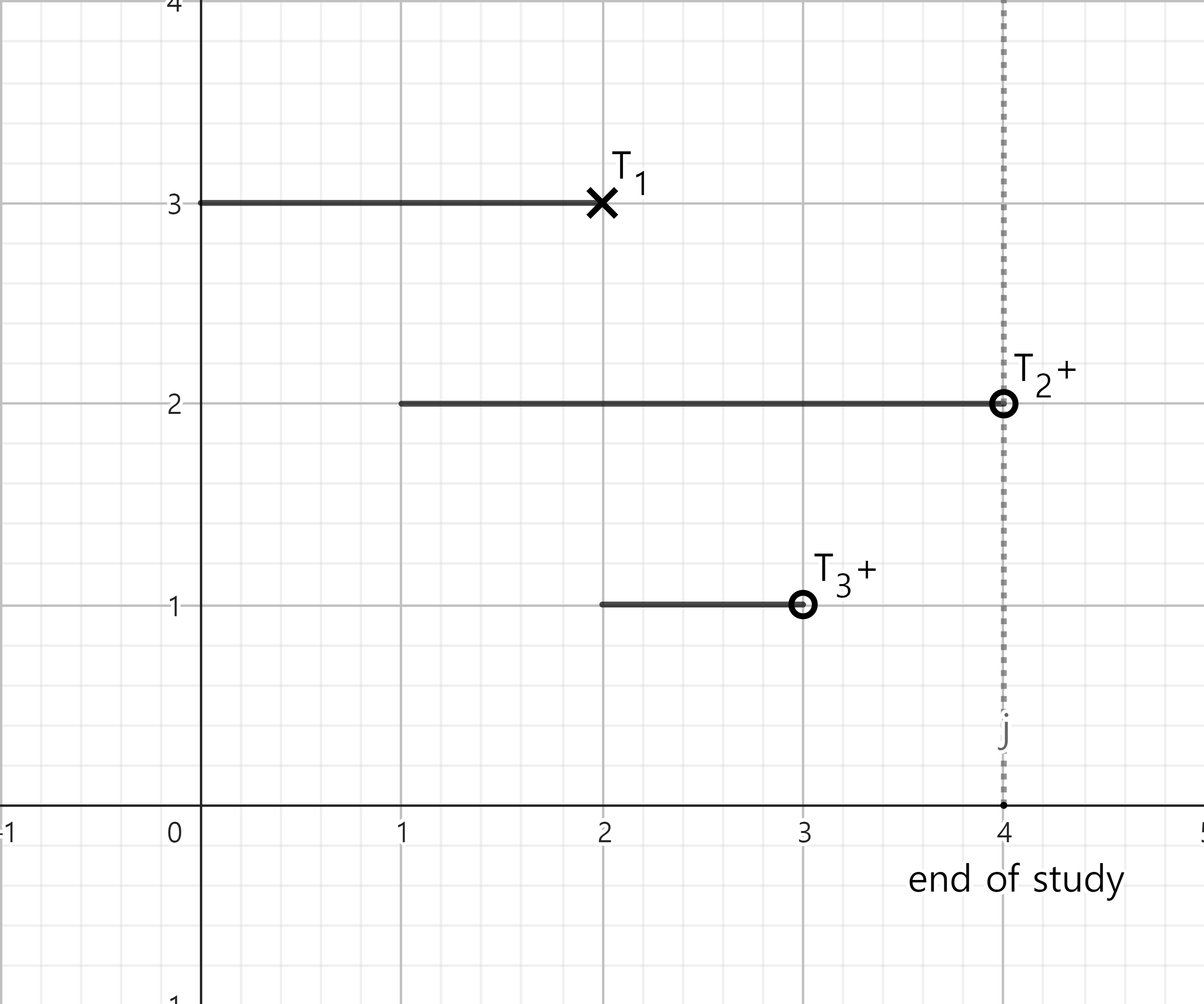 Consider a Random Censoring case . Assume that , and the distinct failure times are where . Let be the number of deaths at , and be the number of alive at where the set is called the risk set at . We only observe