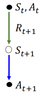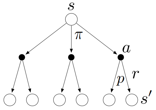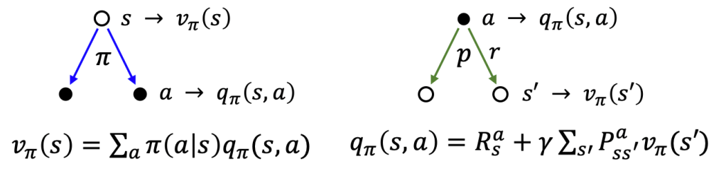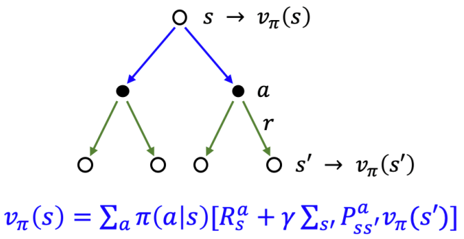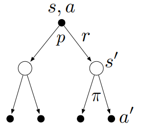 v_{\pi}(s) &= E_{\pi}[G_{t} | S_{t}=s]\\ &= P(A_{t}=a|S_{t}=s)\cdot E_{\pi}[G_{t} | S_{t}=s, A_{t}=a]\quad \left( = \sum\limits_{a} \pi(a|s) q_{\pi}(s, a) \right)\\ &= \sum\limits_{a} \pi(a|s) \cdot E_{\pi}[R_{t+1} + \gamma G_{t+1} | S_{t}=s, A_{t}=a]\\ &= \sum\limits_{a} \pi(a|s) \cdot \sum\limits_{s', r} E_{\pi}[R_{t+1} + \gamma G_{t+1} | S_{t}=s, A_{t}=a, S_{t+1}=s', R_{t+1}=r]\cdot P(S_{t+1}=s', R_{t+1}=r | S_{t}=s, A_{t}=a)\\ &= \sum\limits_{a} \pi(a|s) \cdot \sum\limits_{s', r} p(s', r | s, a)[r + \gamma E_{\pi}[G_{t+1} | S_{t+1}=s']]\quad \text{(by Markov property)}\\ &= \sum\limits_{a} \pi(a|s) \cdot \sum\limits_{s', r} p(s', r | s, a)[r + \gamma v_{\pi}(s')]\quad \left( =\sum\limits_{a} \pi(a|s)[R_{s}^{a} + \gamma \sum\limits_{s'}P_{ss'}^{a} v_{\pi}(s')] \right)\\ &= E_{\pi}[R_{t+1} + \gamma v_{\pi}(S_{t+1}) | S_{t}=s] \end{aligned}$$ ## Bellman Equation for [[Action-Value Function]] ![[Pasted image 20241207130544.png|450]] $$\begin{aligned} q_{\pi}(s, a) &= E_\pi[G_{t} | S_{t}=s, A_{t}=a]\\ &= \sum\limits_{s'r}p(s', r | s, a)[r + \gamma \underbrace{\sum\limits_{a'} \pi(a'|s') q_{\pi}(s', a')}_{v_{\pi}(s')}]\quad \left( = R_{s}^{a} + \gamma \sum\limits_{s'} P_{ss'}^{a} \underbrace{\sum\limits_{a'} \pi(a'|s') q_{\pi}(s', a')}_{v_{\pi}(s')} \right)\\ &= E_{\pi}[R_{t+1} + \gamma q_{\pi}(S_{t+1}, A_{t+1}) | S_{t}=s, A_{t}=a] \end{aligned}$$Link to original