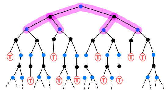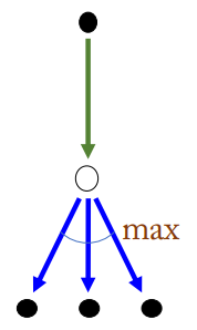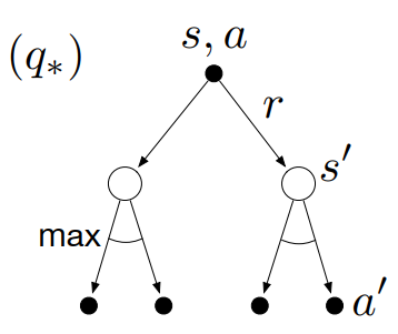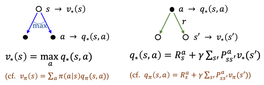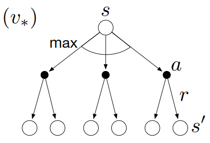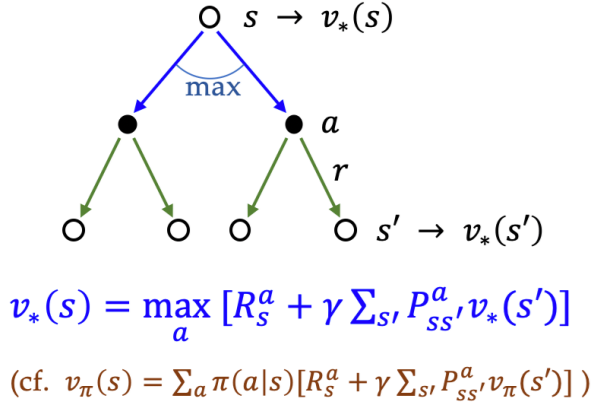 v_{*}(s) &= \max_{a} q_{*}(s, a)\\ &= \max_{a} E_{\pi_{*}}[G_{t} | S_{t}=s, A_{t}=a]\\ &= \max_{a} E_{\pi_{*}}[R_{t+1} + \gamma G_{t+1} | S_{t}=s, A_{t}=a]\\ &= \max_{a} E_{s',r}[R_{t+1} + \gamma v_{*}(S_{t+1}) | S_{t}=s, A_{t}=a]\\ &= \max_{a} \sum\limits_{s',r}p(s', r | s, a) [r + \gamma v_{*}(s')]\quad \left( =\max_{a} [R_{s}^{a} + \gamma\sum\limits_{s'}P_{ss'}^{a} v_{*}(s')] \right) \end{aligned}$$ ## Bellman Optimality Equation for [[Action-Value Function]] ![[Pasted image 20241207152144.png|450]] $$\begin{aligned} q_{*}(s, a) &= E_{s',r}[R_{t+1} + \gamma \max_{a'} q_{*}(S_{t+1}, a') | S_{t}=s, A_{t}=a]\\ &= \sum\limits_{s',r}p(s',r | s, a)[r + \gamma \max_{a'} q_{*}(s', a')]\quad \left(= R_{s}^{a} + \gamma \sum\limits_{s'}P_{ss'}^{a} \max_{a'} q_{*}(s', a') \right) \end{aligned}$$Link to original