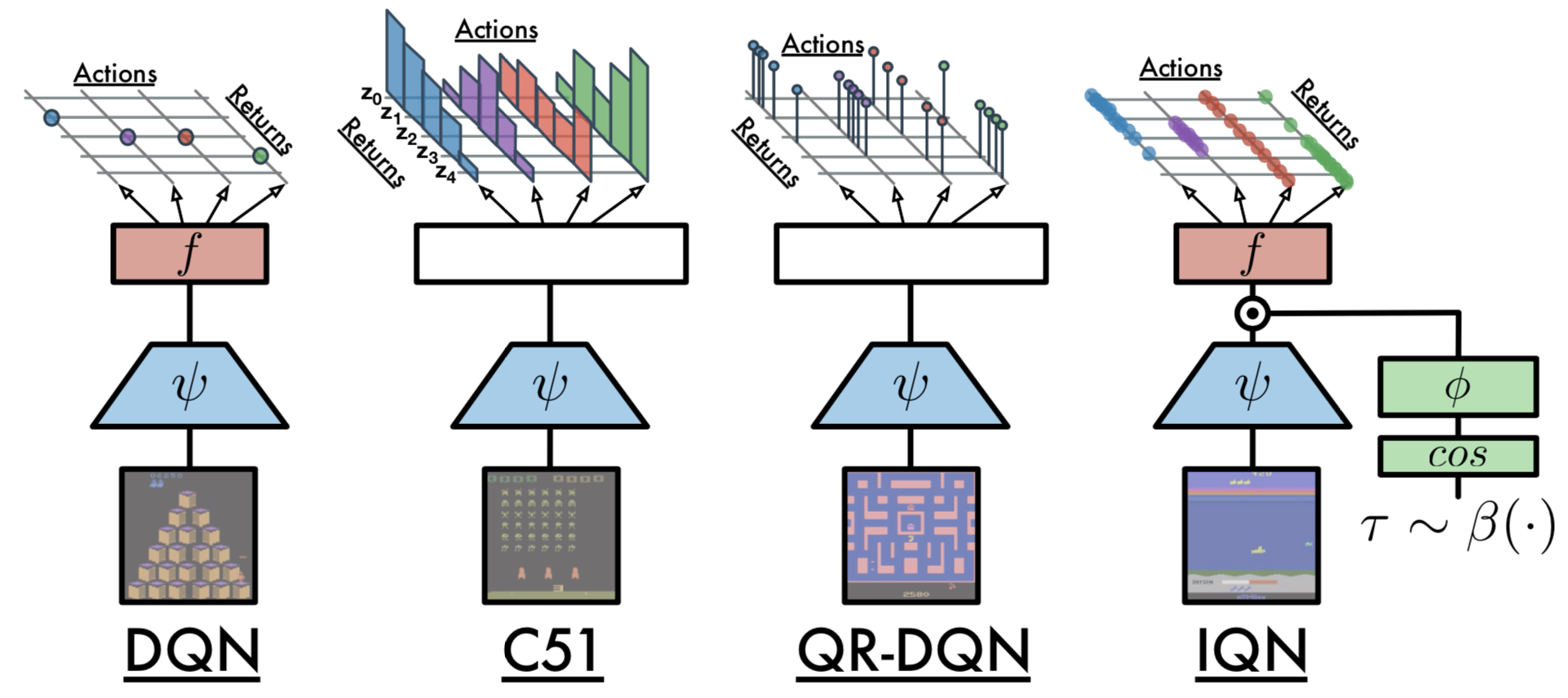 IQN estimates the quantile value for a given state , action , and a quantile fraction . The output is the estimated quantile value corresponding to that fraction .