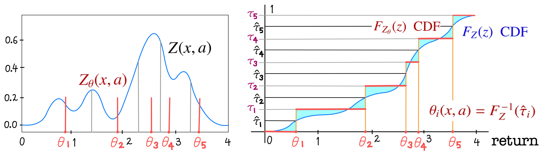 QR-DQN estimates a set of quantiles of return distribution, where represents the midpoint of -th quantile interval. This can be seen as adjusting the location of the supports of a uniform probability mass to approximate the desired quantile distribution.