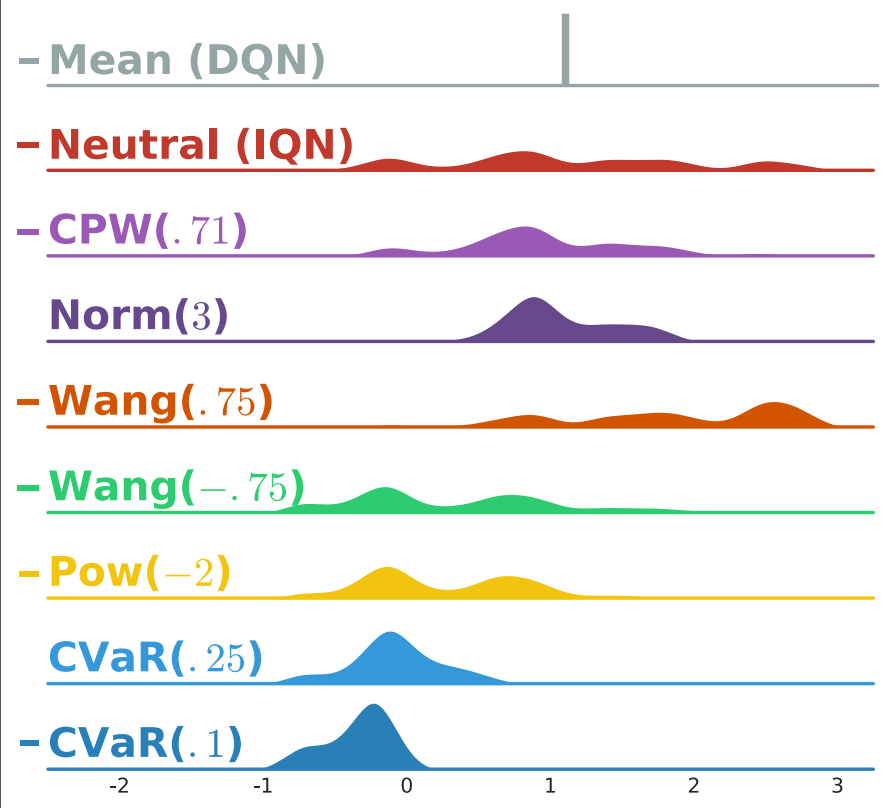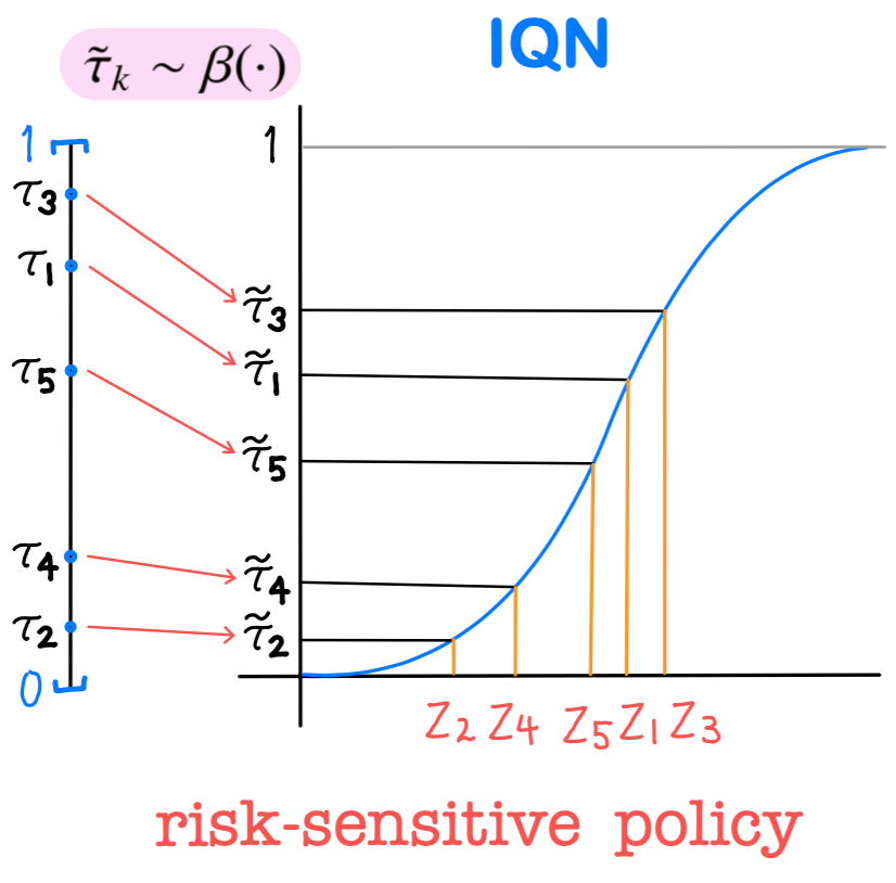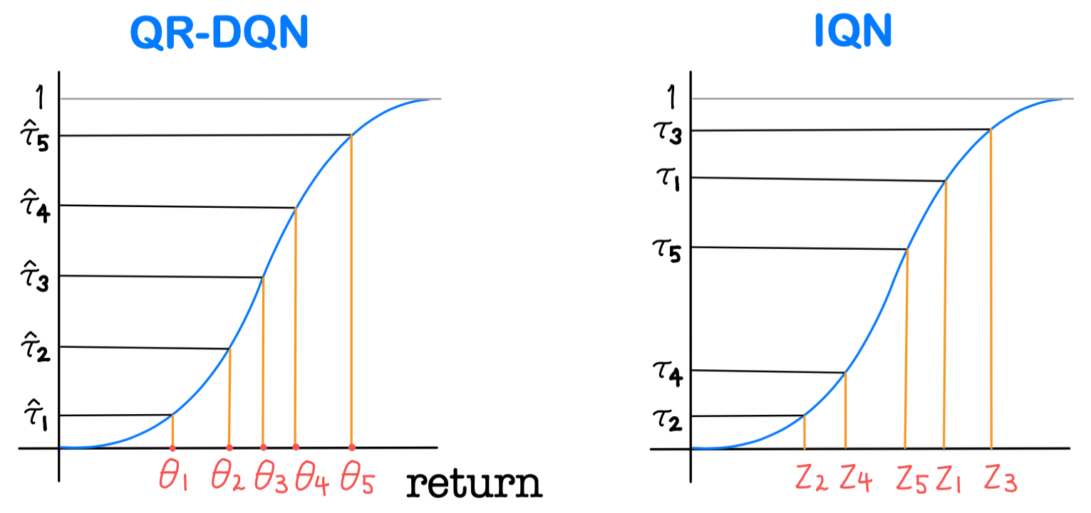 By sampling different quantile fractions , IQN can approximate the entire return distribution. The expectation of the return can be approximated by averaging the estimated quantile values over the sampled quantile fractions where are sampled quantile fractions.