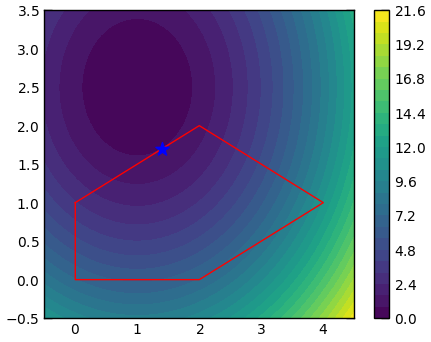 res = minimize(f, np.array([1, 2.5]), bounds=bounds, constraints=constraints)