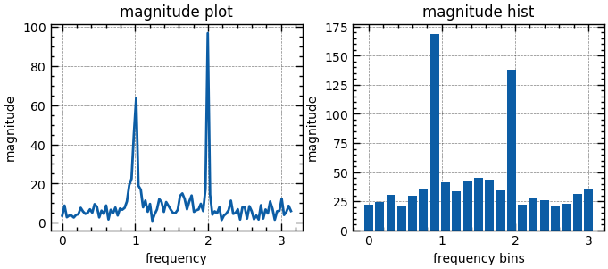axs[1].set(title='magnitude hist', xlabel='frequency bins', ylabel='magnitude')