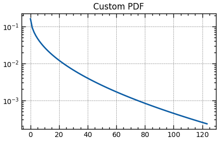 ax.set(title='Custom PDF', yscale='log')