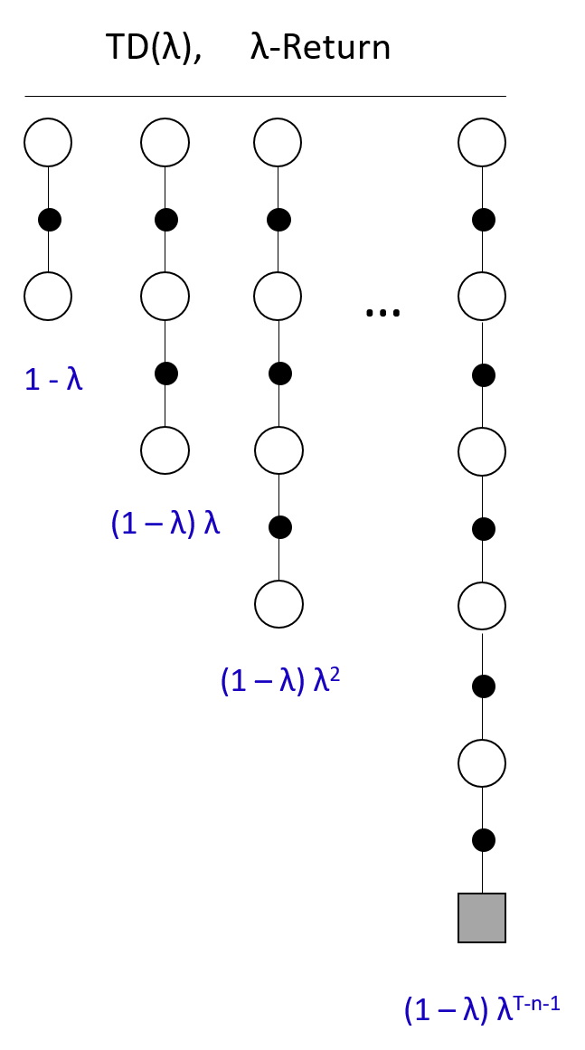 Definition TD(λ) is a TD algorithm that uses the lambda-Return for value function updates. V(St)←V(St)+α[Gtλ−V(St)] where Gtλ is the lambda-Return Examples TD(0): Temporal Difference Learning TD(1): Monte Carlo Method